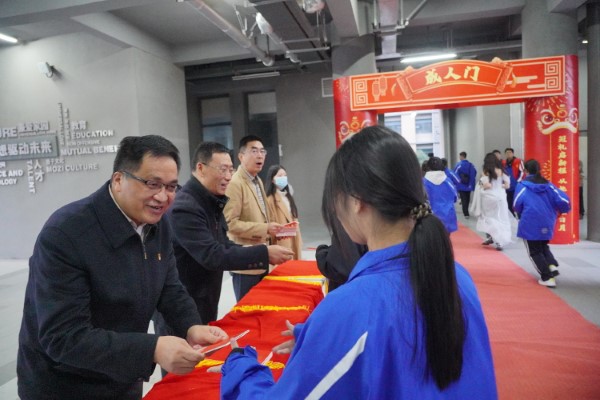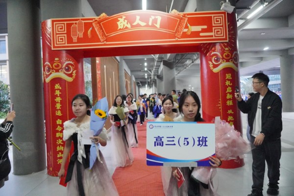 宣誓结束后,“成人门”前成为充满温情的场景。学校领导与高三老师手持《中华人民共和国宪法》读本,逐一为每位身着礼服的学生颁发这份特殊的“成人礼物”。接过宪法读本的瞬间,不少学生轻轻抚摸封面,眼中满是激动与自豪。随后,学子们两两并肩,昂首挺胸跨过“成人门”,每一步都透着对未来的憧憬,正式开启人生的新篇章。