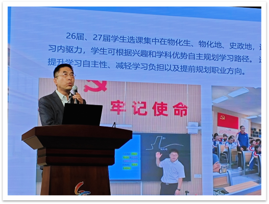 王森首先向家长们全面介绍了学校的发展概况,让家长们对孩子所处的学习环境有了更深入的了解。随后,针对家长们普遍关心的“新高考选科”事宜,王森进行了权威解读与政策指导。他从新高考政策核心要点、不同选科组合的优势与挑战、如何结合孩子的学科兴趣、能力特长及未来职业发展方向进行科学选择等多个维度,进行了高屋建瓴且深入浅出的讲解,为家长们拨开了新高考选科的“迷雾”,提供了极具价值的参考思路。