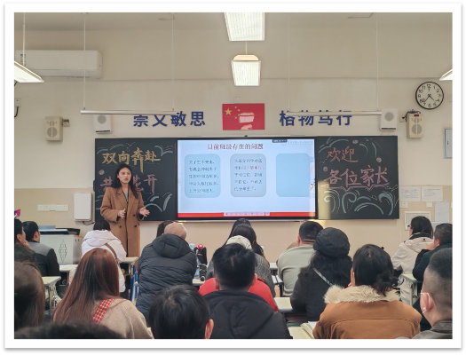 全体会议结束后,家长们移步至孩子所在的教室,进入班级交流环节。各班班主任以期中考试为核心,从成绩分析、问题拆解、班主任建议及沟通技巧四个维度展开分享,为家长们提供了细致入微的教育指引。