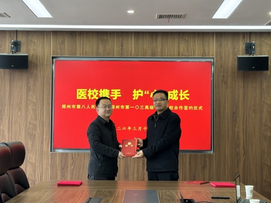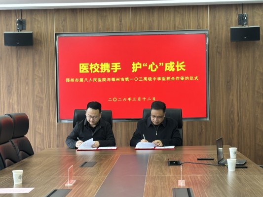 为深入践行健康第一教育理念,扎实推进家校社协同育人“教联体”建设落地见效,进一步提升高中生心理健康教育专业化、规范化水平,精准护航高中学段学生身心健康成长,2026年3月12日,郑州市第八人民医院与郑州市第一〇三高级中学医校合作签约仪式顺利举行。双方秉持资源互补、协同育人的原则,建立长效合作机制,以专业医疗力量赋能校园心理健康工作,共同守护高中生阳光心态、助力青春健康前行。